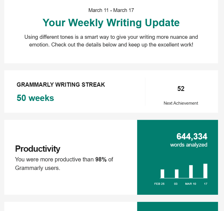 Grammarly also sends me weekly emails with updates about my writing (see the snapshot below).